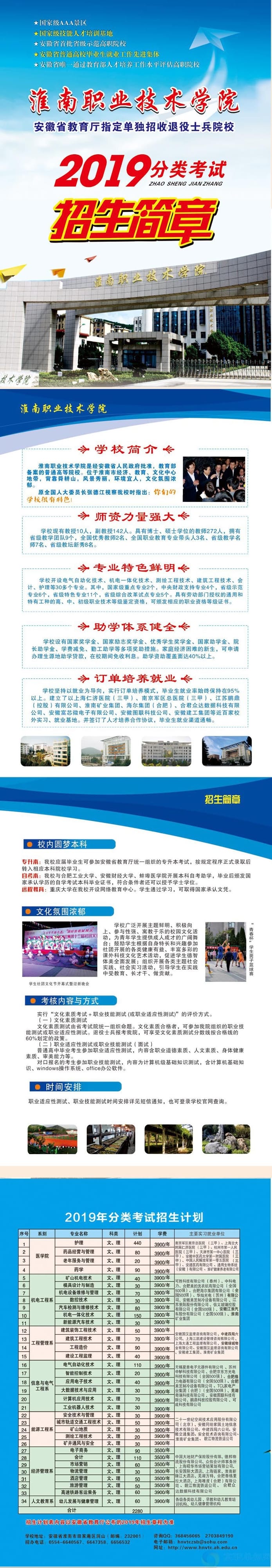 淮南职业技术学院是经安徽省人民政府批准,教育部备案的一所普通高等院校。坐落于淮南市经济、教育、文化中心地带,背靠舜耕山,风景秀丽,环境宜人,教育文化氛围浓郁。学院以工为主,以矿业为特色,经、管、文、医专业协调发展。2000年建院以来,学院秉承现代职业教育理念,围绕行业改革发展和地方经济建设需要,确立“培养把科学技术转化为现实生产力的高技术技能型人才”的办学理念和“吃得了苦、动得了手、记得住安全、说得出道理”的人才培养目标,坚持“专业共同设置、目标共同确定、课程共同开发、教材共同编写、教学共同实施、质量共同评价”为内容的校企合作人才培养模式。学院是教育部、卫生部确定的国家级人才培训基地,2003年代表安徽省率先通过教育部高职高专人才培养工作水平评估;同年,被安徽省委评为高校思想政治工作先进单位。2008年成为安徽省首批省级示范高职建设院校,2014年以良好成绩顺利通过验收和个性化评估。近年来学院先后获得“国家技能人才培育突出贡献奖”、“全国煤矿安全培训先进单位”、“全国煤炭系统教育先进单位”、“安徽省毕业生就业指导先进高校”、“安徽煤矿监察安全培训先进单位”、“煤炭职业教育教材建设先进单位”等荣誉称号。