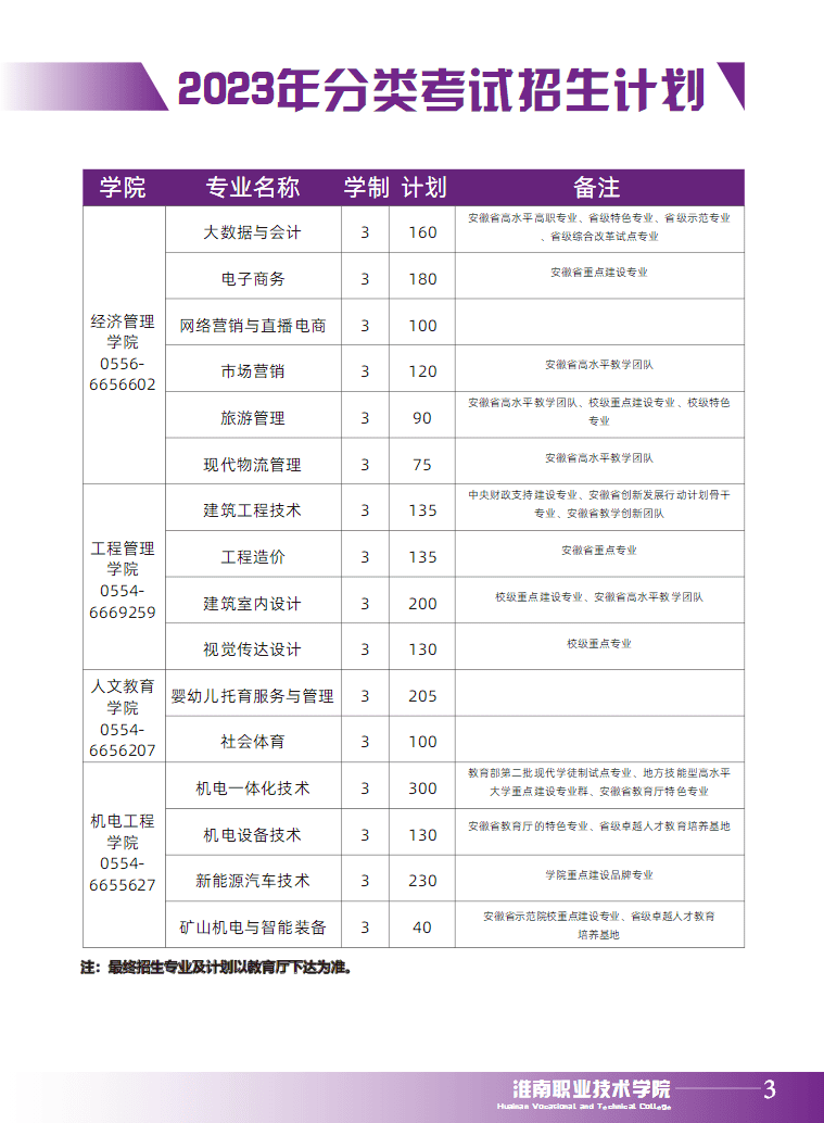 淮南职业技术学院2023年分类考试招生简章
